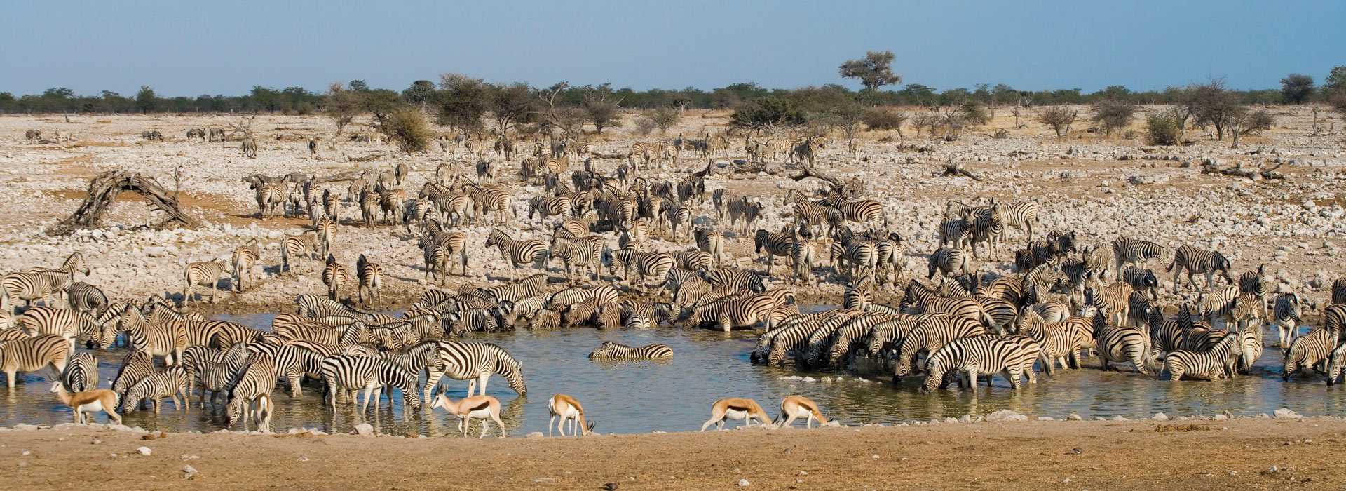 The Etosha National Park in Namibia is different to other parks because it covers a vast salt pan. The outer edges of the park are more fertile with grassland and thorn scrub. The park is home to some of the more endangered animals on the continent such as the oryx, black-faced impala and the black rhino.